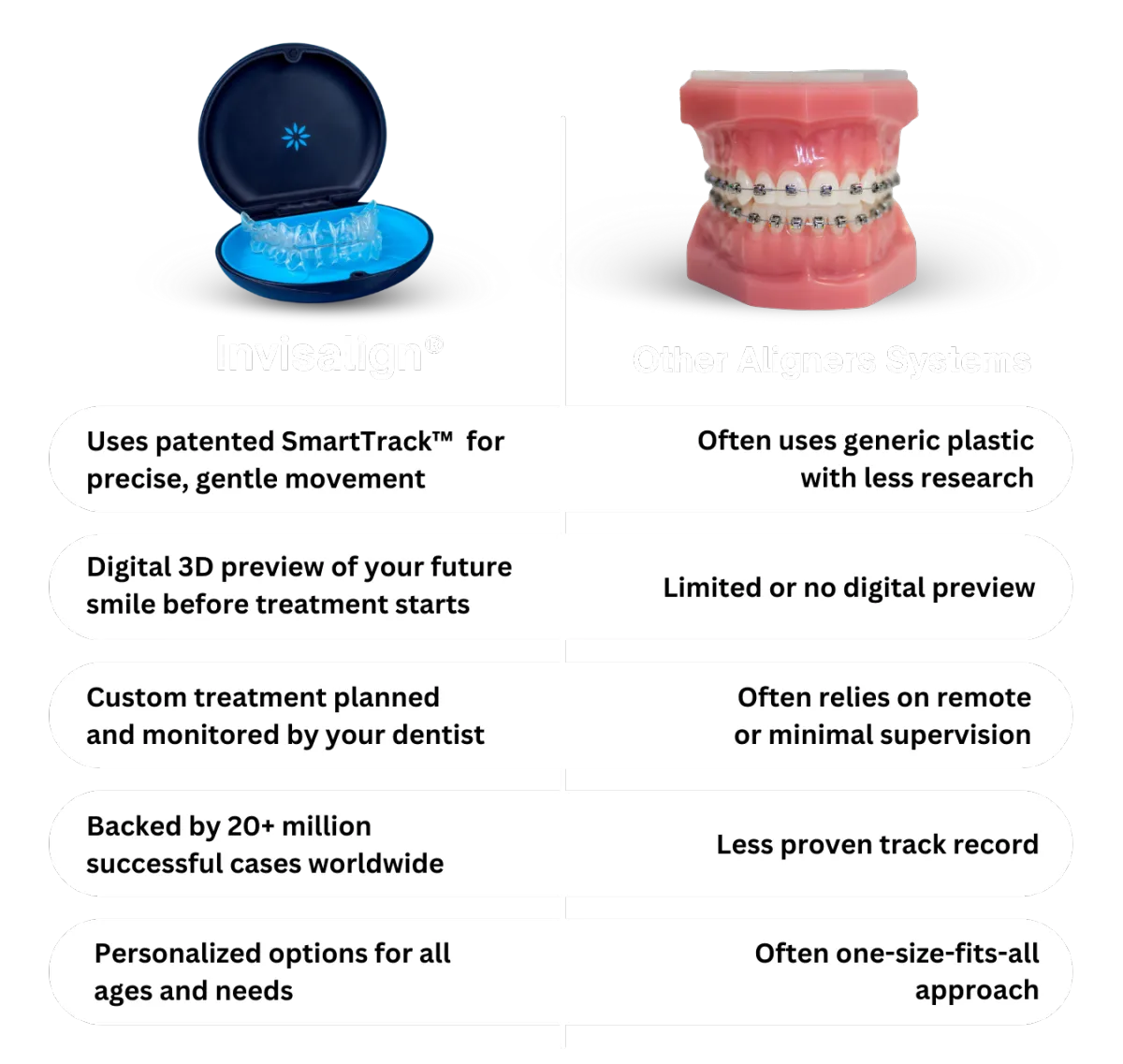 Traditional metal braces rely on brackets and wires that can feel bulky, trap food, and make brushing or flossing difficult.